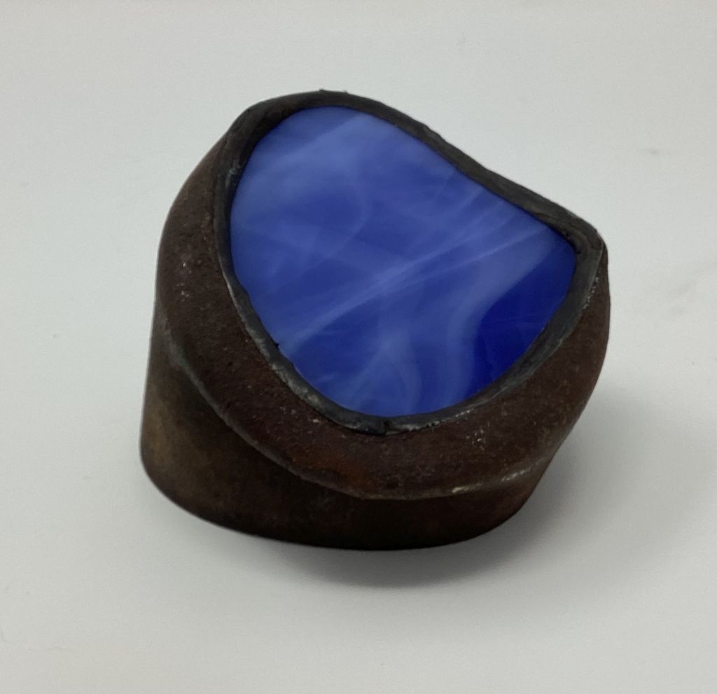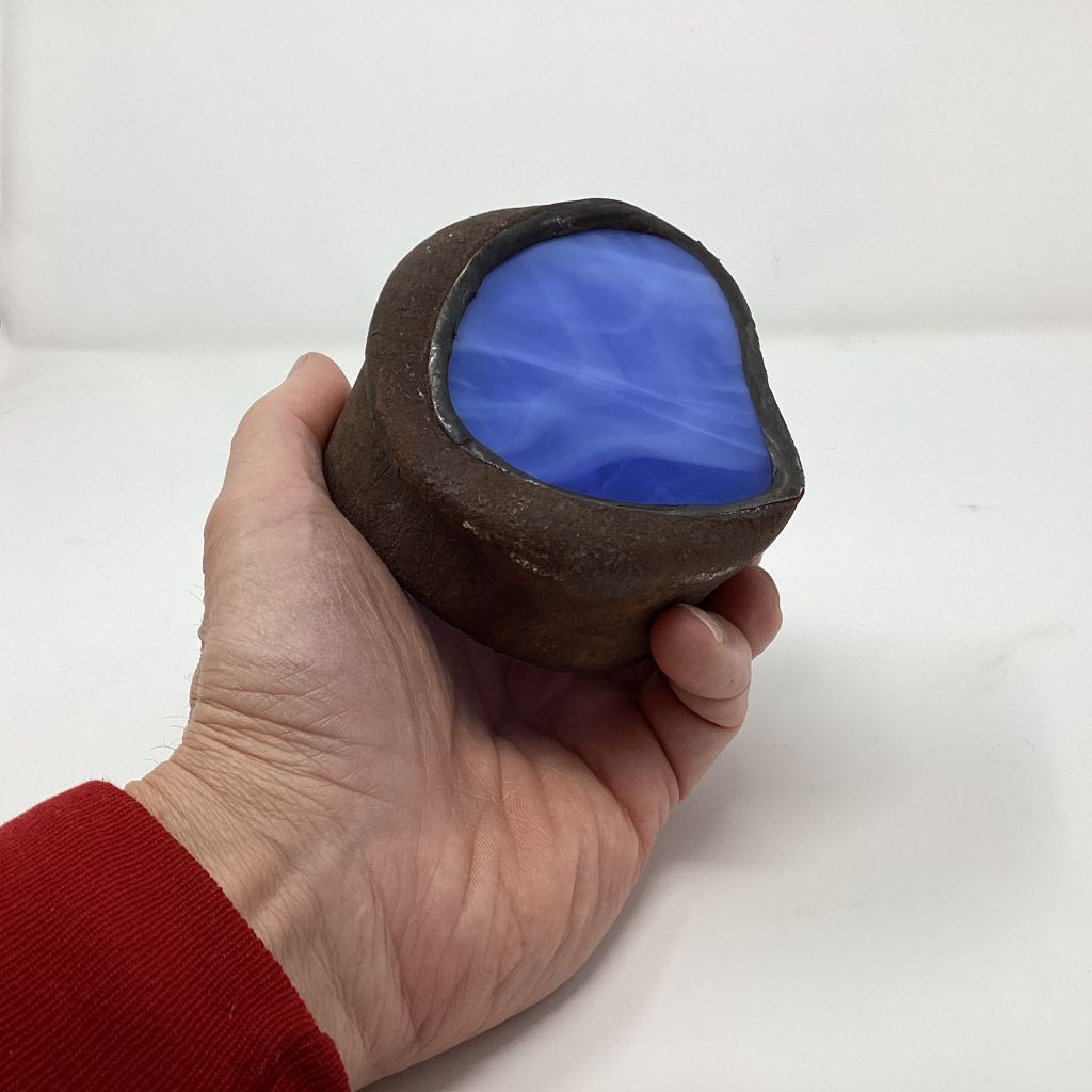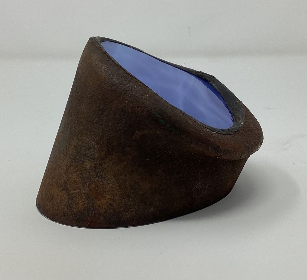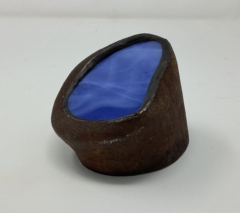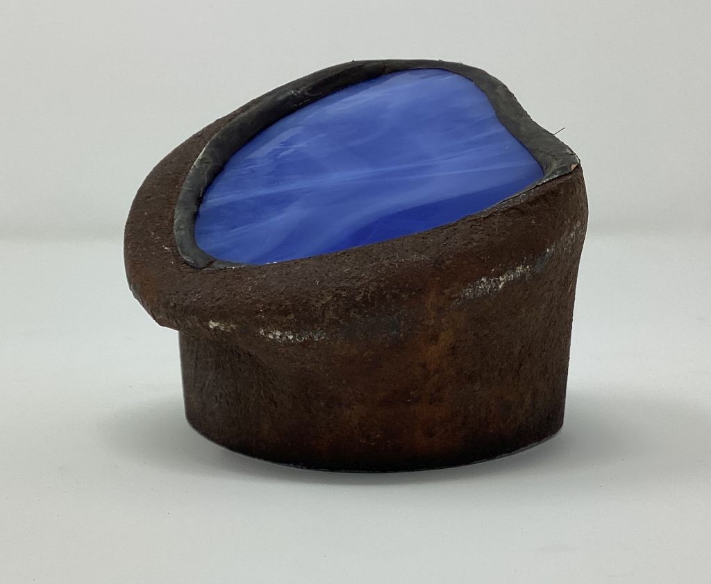 Enjoy the stunning contrast of the rusty crushed pipe with a beautiful blue glass embedded surface.