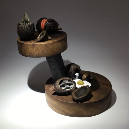 Stained glass and oak inlayed into steel. Comes with an attachable "shadow" for cloudy days.